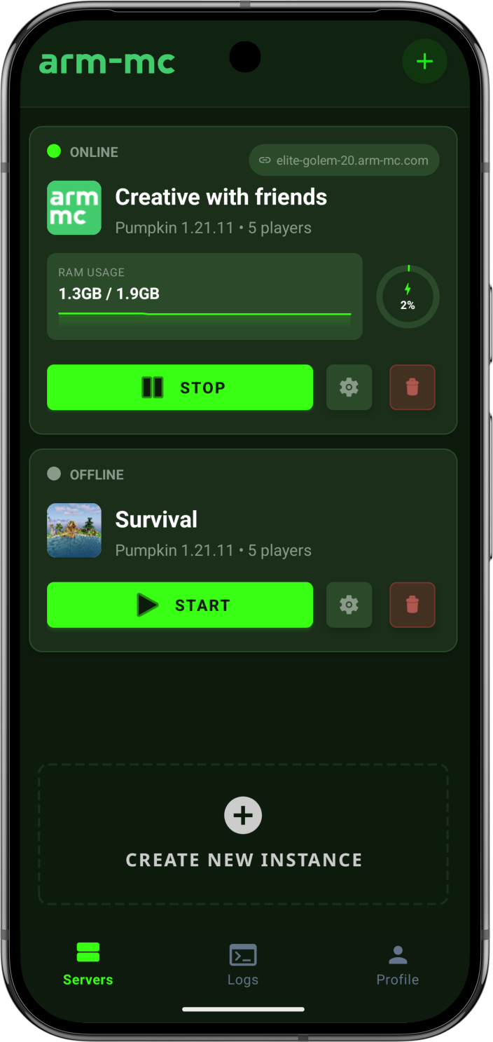 Launch your server in seconds without any terminal knowledge or complex configurations. Just tap and play.